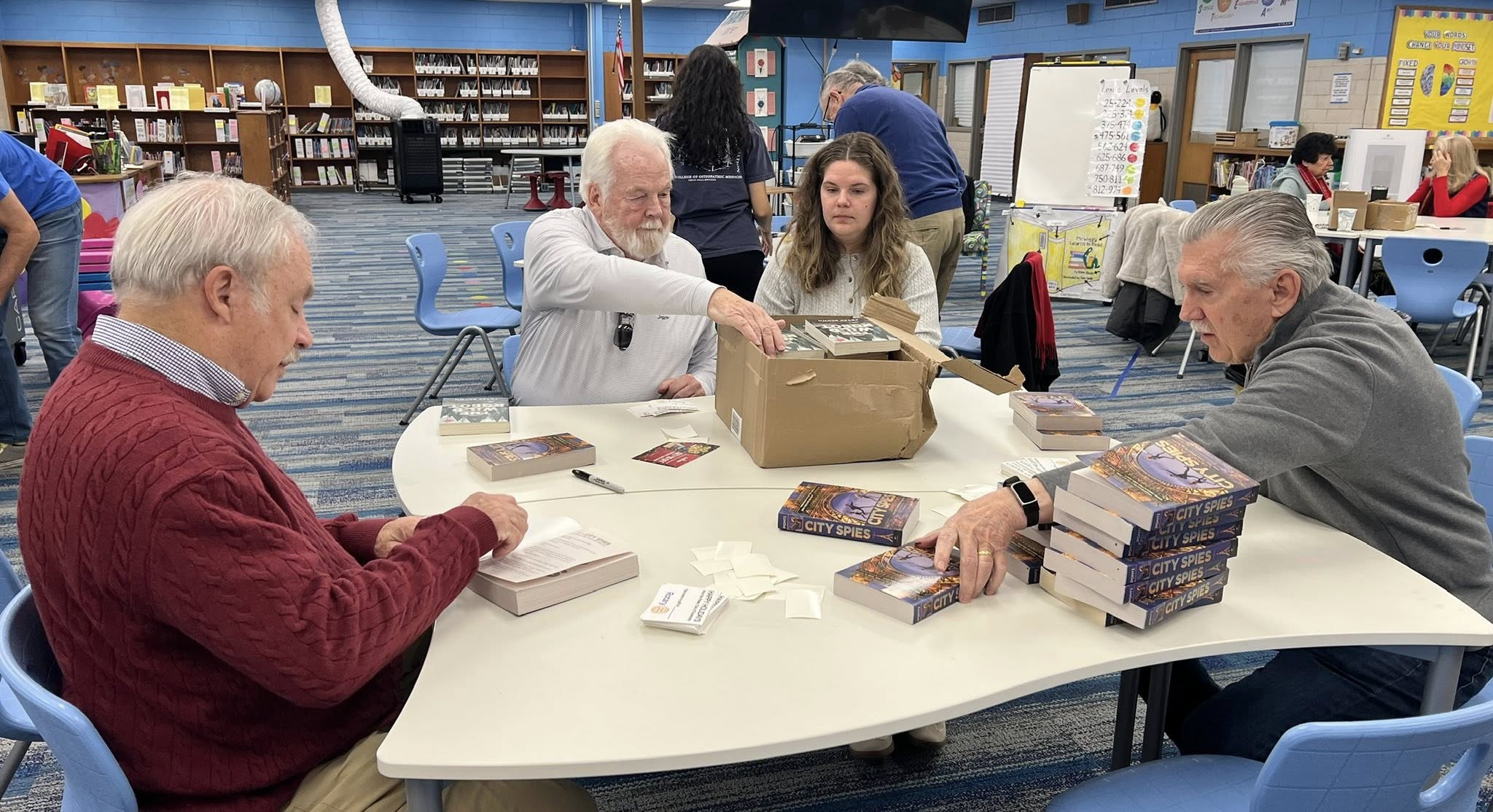 The school media specialist selected the books based upon age appropriateness, reading levels and other academic considerations.  Rotarians acquired the books, labeled them with Rotary placards as being gifted by the Rotary Club of Dunwoody and RI, and the books were distributed to the children.